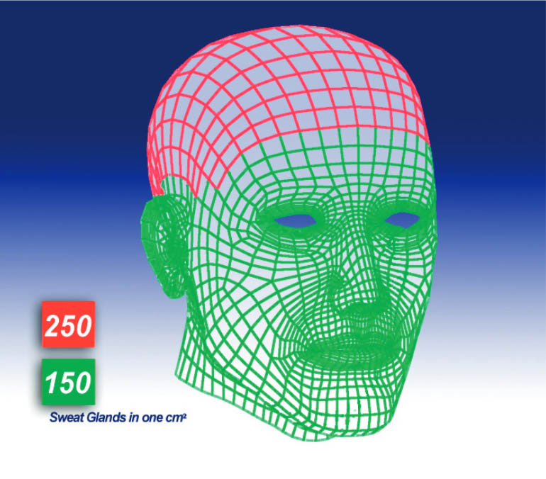 Le ghiandole sudoripare sono distribuite su tutta la superficie della nostra epidermide ed una delle maggiori concentrazioni si ha nella parte superiore
